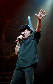 Johnson, who replaced original party animal, Bon Scott, who incidentally died from alcohol abuse 20 years ago, was chosen more for his raspy and shrill voice than his stage persona or songwriting ability. On "Hell's Bells" Johnson clumsily ran down the runway to a large bell that was descending from the rafters. Johnson is no Tarzan. After climbing the rope he pointlessly hung there for a few seconds and then he jumped off. That was it. The sweat-drenched Angus Young got into the act with a 8 minute striptease that only resulted in him finally taking off his shorts to reveal - a pair of stars and stripes boxer shorts. It was a total waste of time.